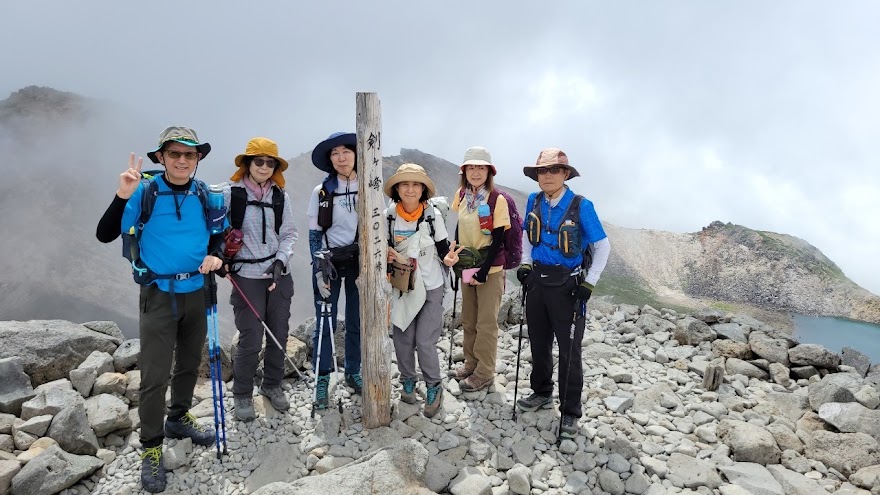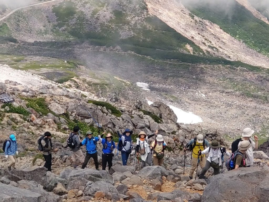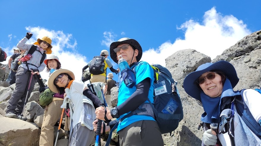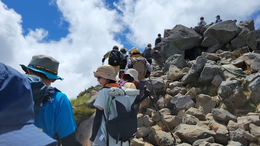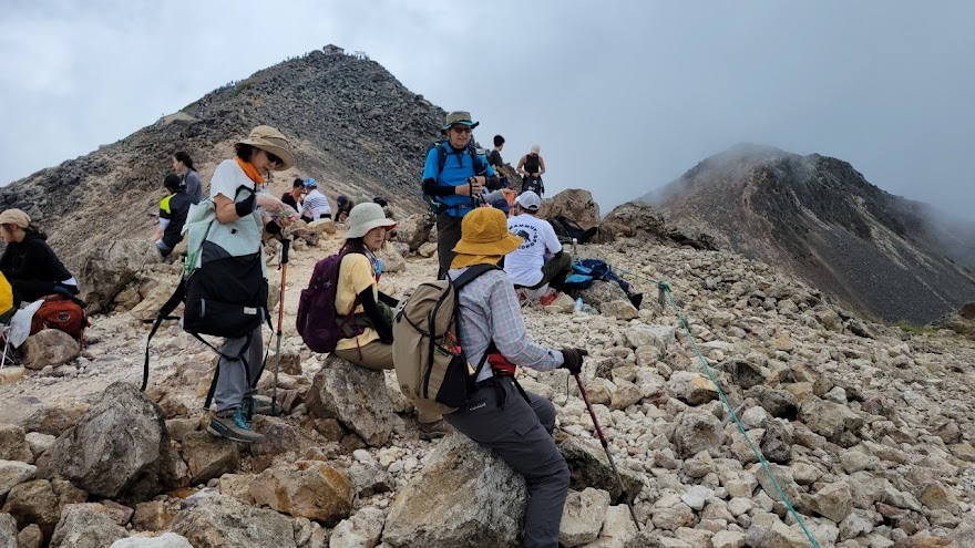 9時の登山バスに乗れた。往復4000円。途中、4~5か所のバス停を経て、10時10分畳平に着く。2700mの高所に慣れるため、パロール小屋の前で登山に備え食事を摂る。日陰での休憩に肌寒く,日なたに場所を変える方もいるほど、酷暑の下界からは考えられない環境だ、風穏やかで気持ちがいい。肩の小屋まではなだらかな道であるがゆっくりと花を見ながら歩く、道沿い、富士見岳の西側にはコマクサが最盛期、以前に比べるとコマクサの多さにびっくりする。今回は初めての乗鞍岳となる参加者3名、初めてコマクサを見る方もあり良かった。肩の小屋までの風景がいい、白雲荘など建物の屋根が赤く、青い池の水面、山の緑、青空がマッチして絶景だ。11時20分肩の小屋で休憩、登山者の多さに驚く、長い列が山頂に続く。いよいよ登山開始、登山道に迷うことはない、登山ペースをゆっくりとして高度に慣れるように、女性に先頭を任せ、棚橋は最後列を歩く。先頭の判断で時々立休憩しながら、蚕玉岳で小休止、山頂が近くなった。山頂の手前からは渋滞で動かず、皆さん記念撮影の順番待ち、20分ほど待たされる、時折ガスが流れる。我々の記念撮影の時にバックにガス流れてきた。バックが青空とはならずも記念撮影はいい時に終わった。山頂真下の小屋でコーヒータイム15分その後は15時05分のバスに間に合うように休憩なしで下山、山頂付近はガス出てきた。畳平のバス停はすごい列だが、バスは何台もいるので安心して並ぶ。少し遅れるも予定通り下山バスで観光センターへ下山。ゆっくり休んで帰路に着く。お風呂もやめて直帰した、一般道、高速も車多く、ゆっくり走る。大和SAで小休止、20時20分岐阜県庁に無事帰還。初めて3000m超えを登った方、初の乗鞍岳、皆さん満足されたことと思います。とにかく快晴でよかった。お疲れ様でした。