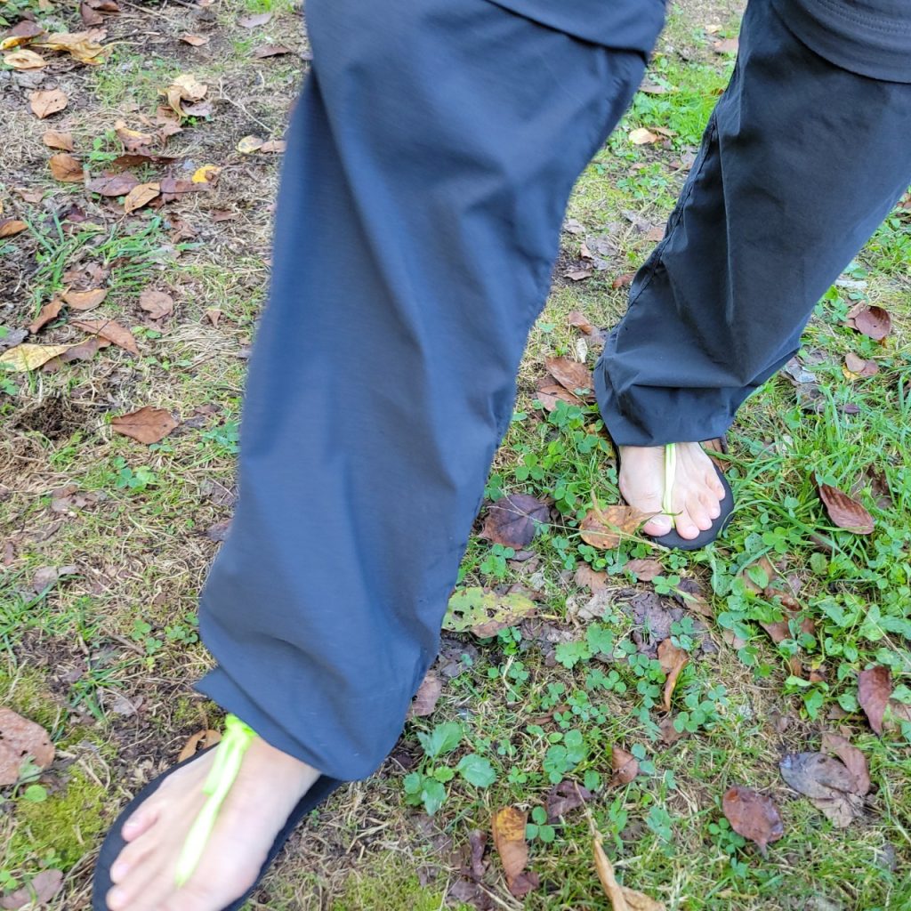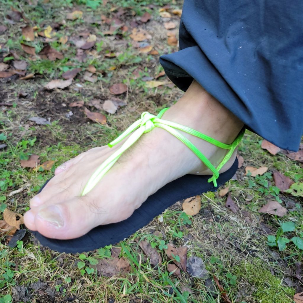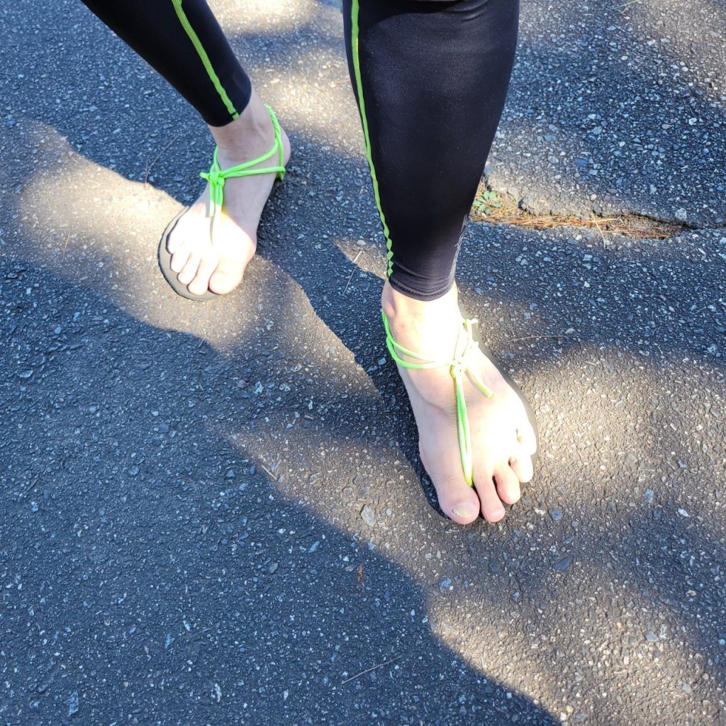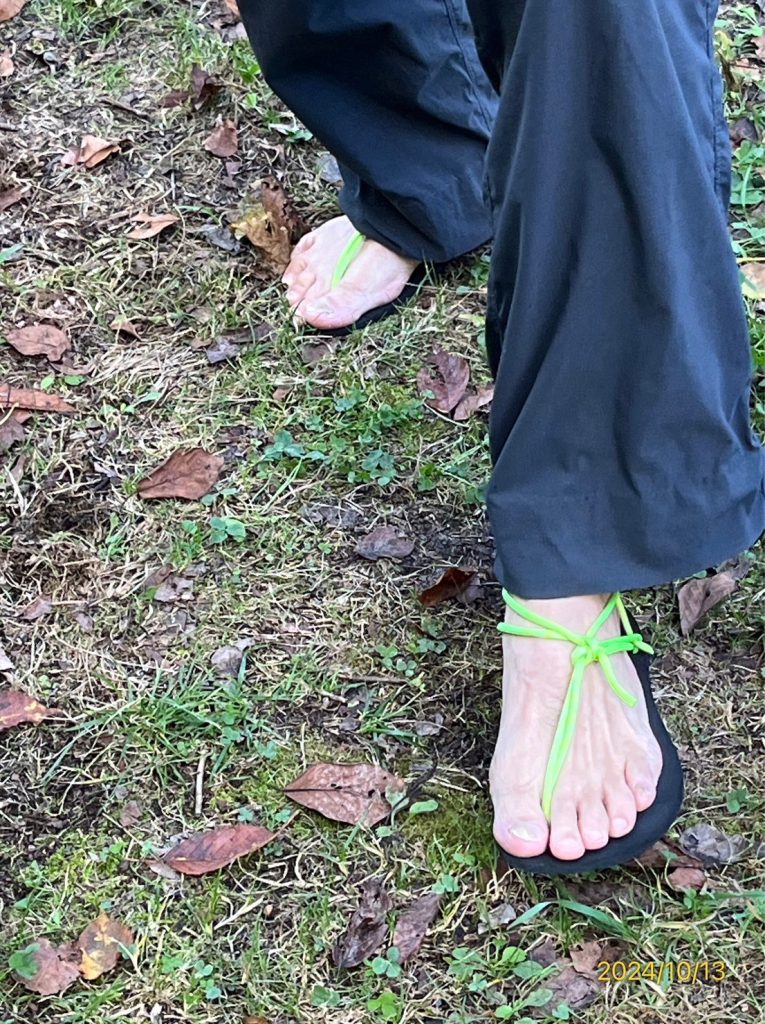 まず名前は、「マンサンダル」というそうです。限りなく裸足に近い履物を追求して開発されたサンダルです。見た目はわらじで、ちょっと見ただけでは、何も履いていないようにも見えてしまいます。すれ違った登山者は、「裸足で登山している!!」 と びっくりしていました。ランニングフォームが改善される、足が鍛えられる、足指を使えるようになる、軽くて持ち運びしやすい などのメリットがあるそうです。中島さんは、これを履いて、今回の山行 光城山・長峰山を完歩されました。すでに、金華山、権現山でも履いて、快適であることを確認されての今回の参加だったとのことです。もうモンベルの高い靴はいらない と言われています。只、快適に歩くには、多少の技術習得が必要だそうです。ちなみに、3000円です。皆さん 試してみては?