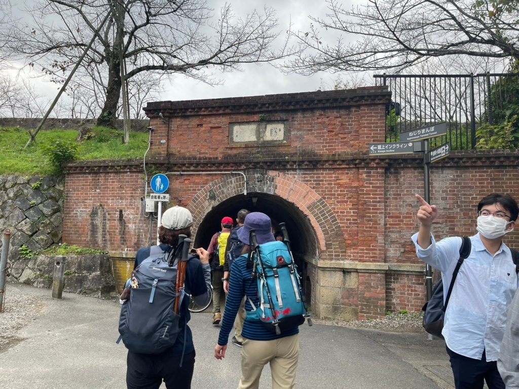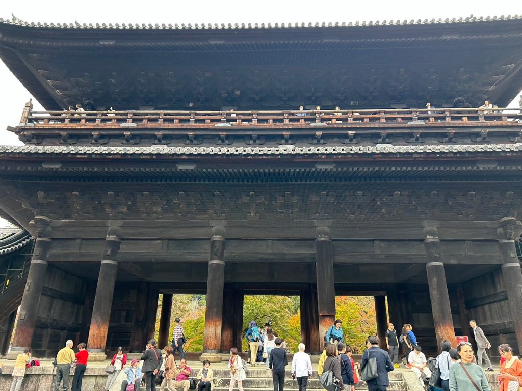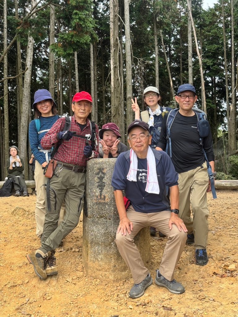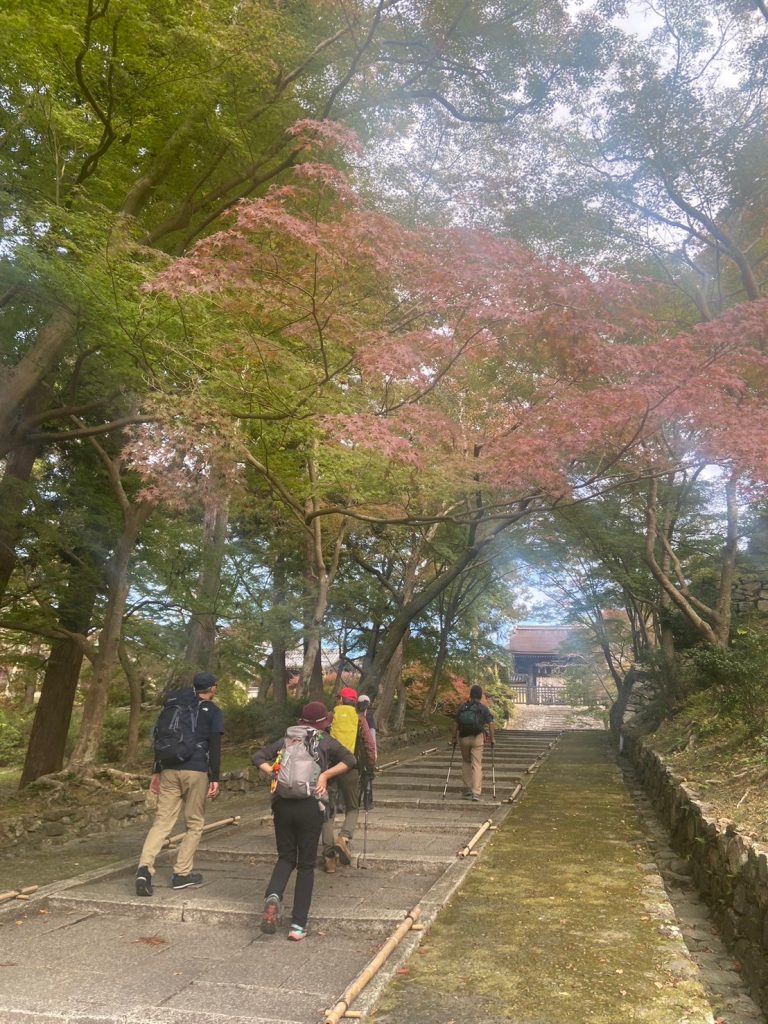 11月も後半になり、北風が吹いていそうな頃なのに、全く風もなく、寒さを感じない岐阜駅ホームを7:22発 米原行きに乗って出発した。天候は曇りで、京都地方の予報も曇り、午後後半に小雨との予報であった。電車はそれほど混んでなく、6名全員が座って行けた。米原駅での乗り換えも向かいのホームの列車にゆっくりと乗り移り、席も十分に確保できる程度の込み方であった。以前の「青春18きっぷ」が使えた時期の激こみとは全く違っていた。9:10 山科駅到着。トイレを済ませて出発 9:20。山科駅のトンネルを通って、毘沙門通りを北に進み、毘沙門堂の勅使坂に到着した9:45。暖かさの影響で、やっと紅葉が始まったといったところで、緑と薄い赤色がまだらで、落葉もほとんどなく、勅使坂一面の赤い絨毯にはもう一週間は必要かと思われた。境内も人の姿は少なく、ちょっと寂しい風情であった。毘沙門堂を後にして林道に戻り、後山階陵登山口へと進んだ10:00。登山道とはいうものの林道で非常に歩きやすかった。ところが、30分ほど進んだあたりから倒木が林道を覆った倒木地帯に突入した。一帯を見渡すといくつか登山道らしき道がポツポツと見えるものの、どれも倒木が道をふさいでいて、途切れ途切れで一つにつながらない。倒木のジャングルジムを登ったり、跨いだり、くぐったりしながら、体じゅうの筋肉を使って何とか通過した。その後は、倒木はあったものの整備されており、問題なく登ることができ、経塚山分岐についた 11:00。ここからは、稜線歩きとなり、京都市街側からの登山道と合流しながら北上した。登山客も次第に多くなり、登山道は賑やかとなり、程なくして大文字山 山頂に到着 11:20。曇りではあったが高曇りで視界はよく、京都市街、京都を取り囲む山々が良く見えた。山頂の広場には多くのベンチ等が置かれており、登山グループが陣取って賑やかに昼食をとっていた。展望を堪能し、大文字の火床へと下降を開始した 11:35。樹林の中を急降下した。結構な距離を降りるという感じで、途中で別の登山客に道を確認する程の下降であった。急に視界が開け、火床に到着 11:50。「大」の字の2画目の書き始めの所の火床の脇に陣取って昼食をとった。展望抜群のテラスでの昼食でゆったりとできた12:30。昼食後、「大」の字の2画目の左払いに従って脇の急階段を下降し、払いが終わったところから樹林帯に入った。分岐が多く、いちいちヤマップで確認しながら慎重に下降し、法然院に到着 13:10。庭を鑑賞した後、哲学の道を南下し、永観堂の脇を通り、南禅寺に到着 13:55。南禅寺を観光し、蹴上駅 14:40、山科駅 15:05、米原駅 15:53着、16:00発、大垣駅 16:33着、16:41発と順調に乗り継いで岐阜駅 16:52着 解散した。