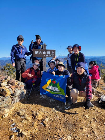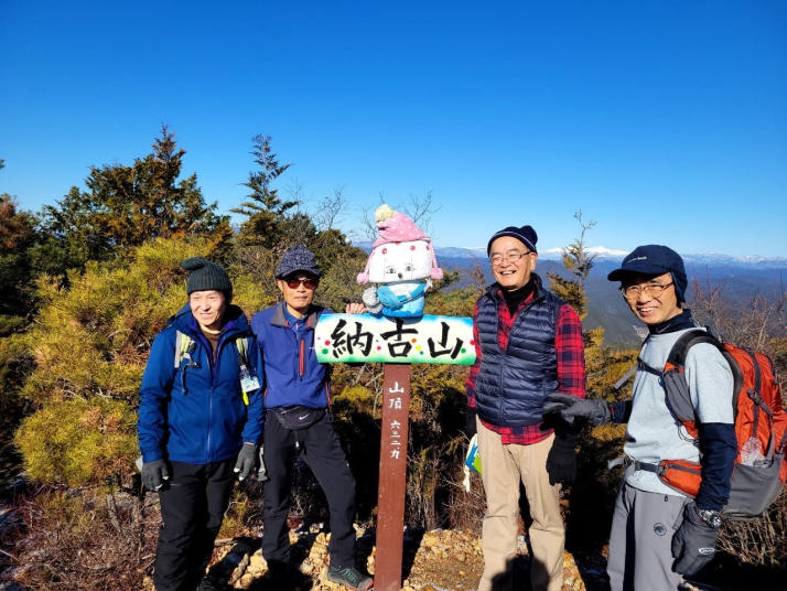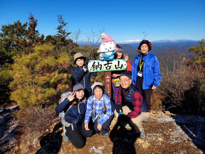5分ほど歩くと納古山の登山口の表示があり、8時10分林道に入り、8時50分林道から初級コースの登山道に入る。最初はなだらかな登山道で、尾根筋に出ると短い急坂もあるが概ね歩き易い登山道。10時に山頂に到着。