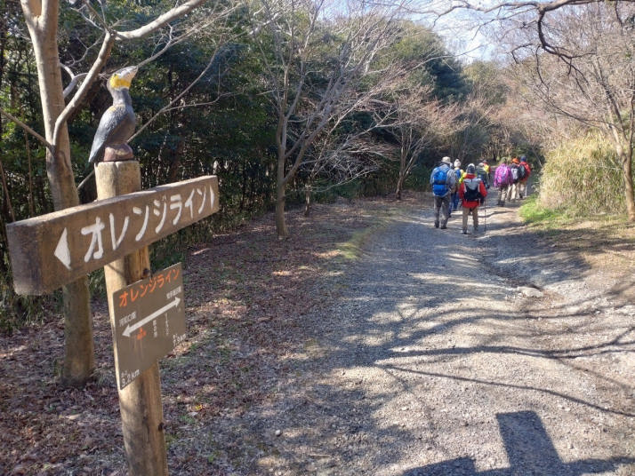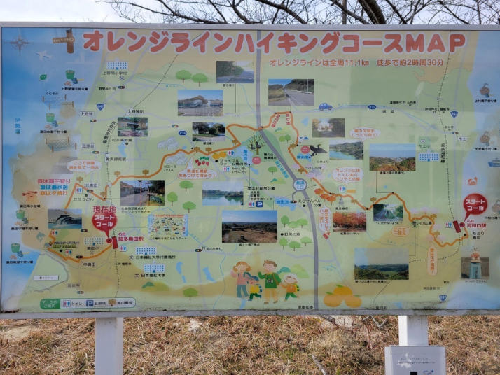 堤防を南に少し進み、お寿司屋さんの脇の道からオレンジラインに入っていった(標識がないので、お寿司屋さんを目印にする)。道路上にオレンジラインのタイルが貼ってあったが、年月を経て、破れていて、何とか読み取れる程度であった。しばらく民家がある少しきつめの坂道を登ったところに、オレンジラインの標識を見つけた。その後は、分岐箇所毎に標識や案内板が設置してあり、道に迷うことはない。道はよく整備されており、トレランでも十分使えるようであった。