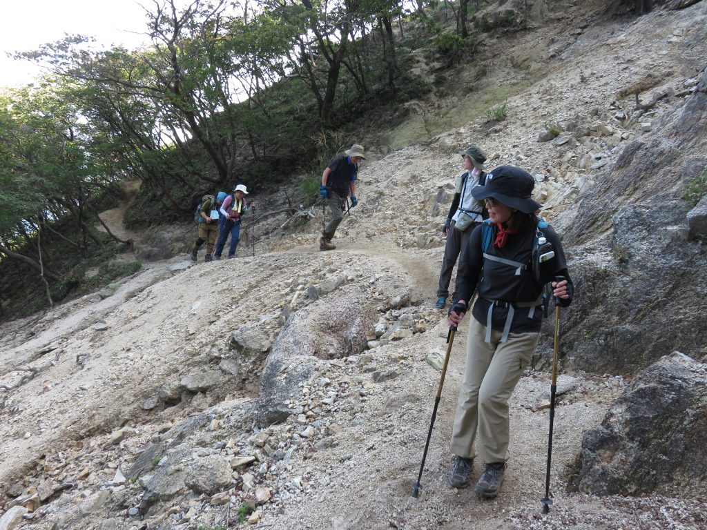 登山口9:26、梅田峠9:40、仏岩10:00。計画以上のペースで順調に進みました。みんな凄いなぁ。楽しそうに会話が弾んでいるし、ひ~ひ~言っているのは私だけ?なんとなく感じるくらいに降っていた雨がちょっと気になる降り方をしてきたので、各々カッパやザックカバーを装着し、予定にあったラクダ岩を省略して先を急ぎました。